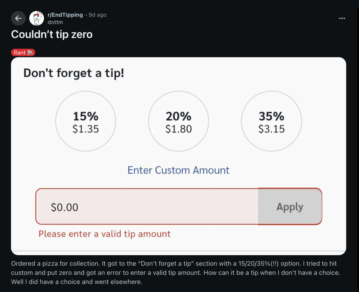 Let’s set the scene: You’re craving a pizza, so you hop online to place a simple pickup order. You expect to pay for your pie, maybe leave a tip if you’re feeling generous. But when you reach the checkout screen, you’re greeted with a not-so-friendly reminder: “Don’t forget a tip!” The options? 15%, 20%, or a whopping 35%. There’s a “custom” box, but—surprise! If you try to enter $0, the website flashes a red warning: “Please enter a valid tip amount.” No tip, no pizza.