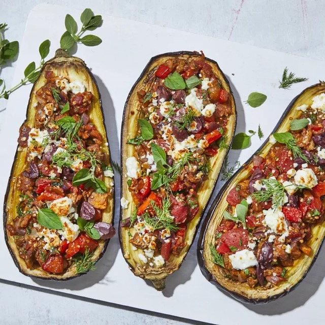 - Divide the mixture into the eggplant shells, top each with feta, and broil until golden and bubbly—about 6–8 minutes.