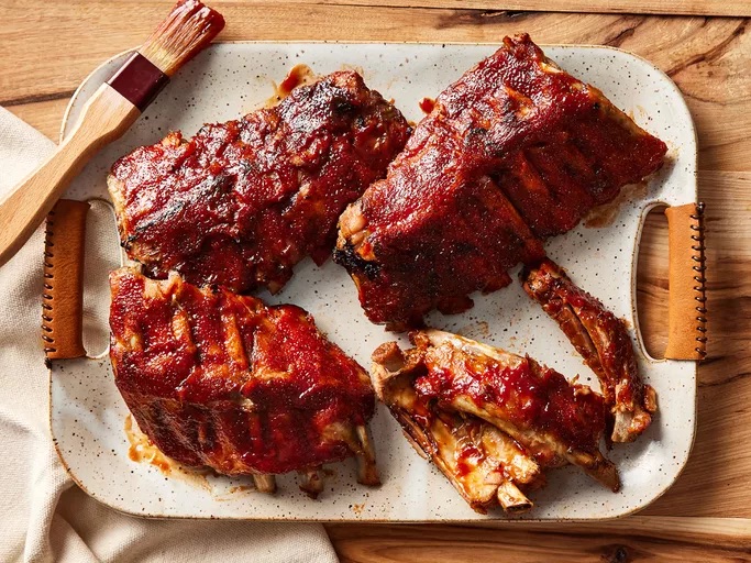 - Transfer ribs to a baking sheet, discard onion and garlic, and coat ribs with BBQ sauce.