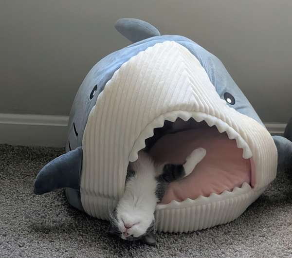 That cozy little shark has officially claimed its first victim—and it’s aww-dorable. This sleepy cat looks perfectly content halfway “swallowed,” paws in the air and dreaming away. Talk about a purr-fect napping spot! Have you caught your own pet in a scene this lovely? Send us your favorite photos!