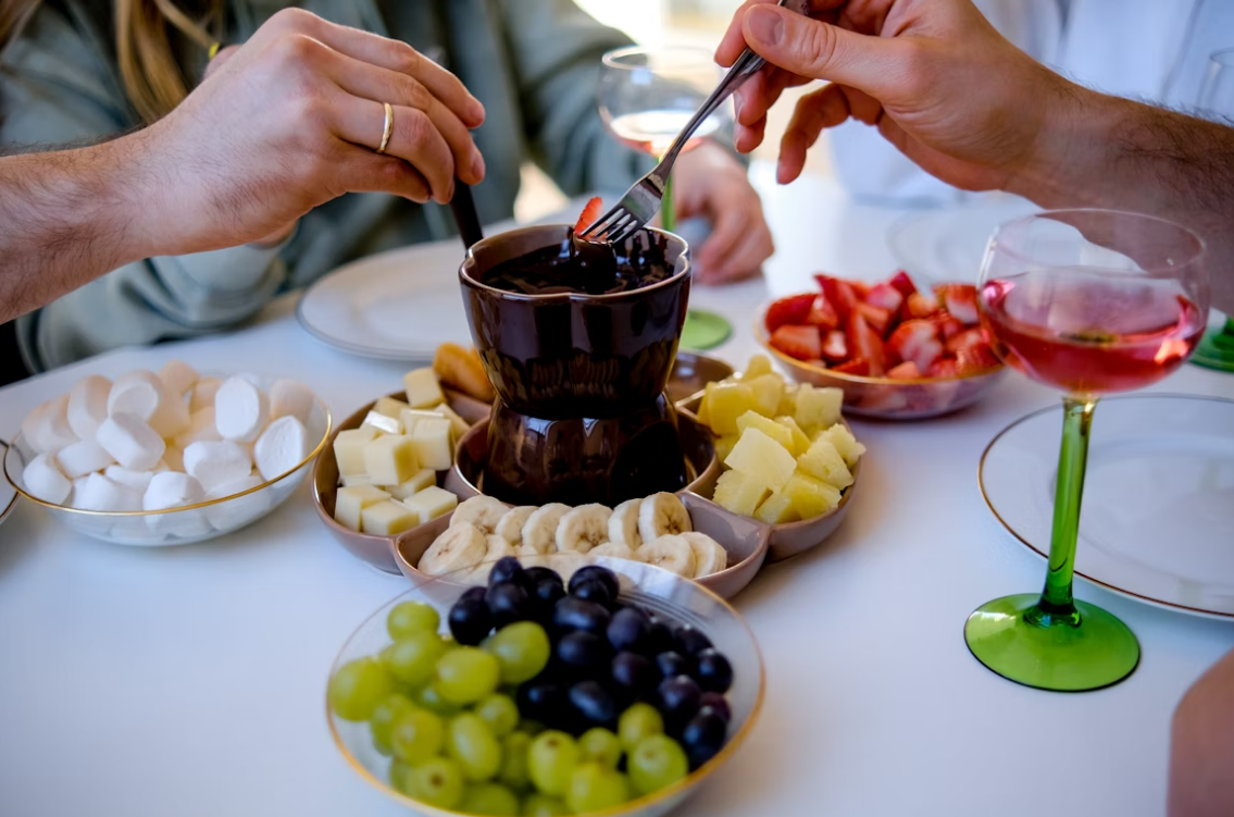 Chocolate fondues allow for both traditional and creative pairings, with fruit like strawberries, pineapple, and cherries alongside cookies, cubed cake, and donut holes providing a variety of textures and flavors.