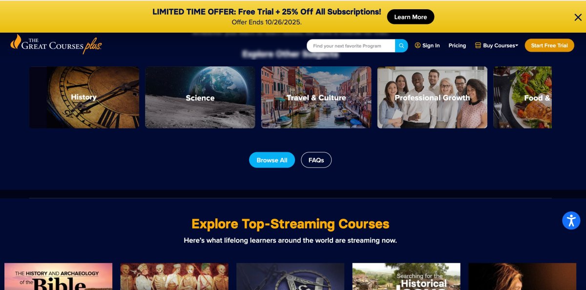 Visit thegreatcoursesplus.com, sign up for a free trial, and browse by subject.